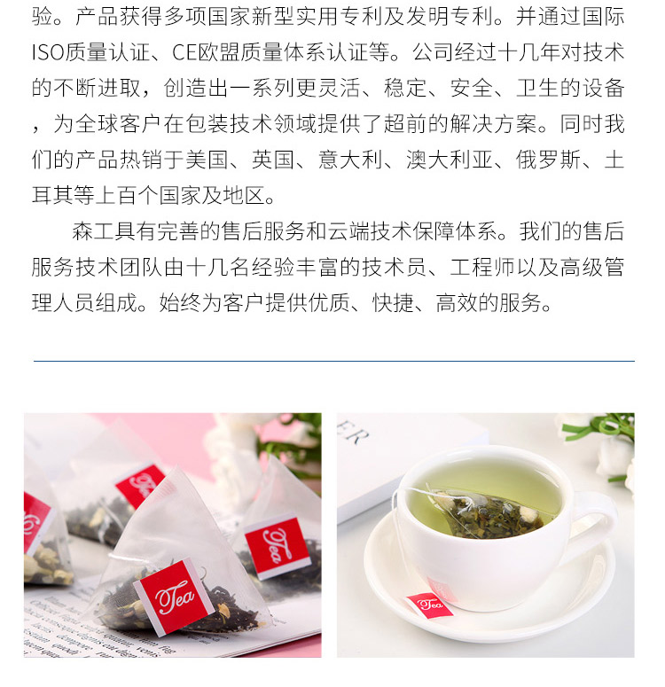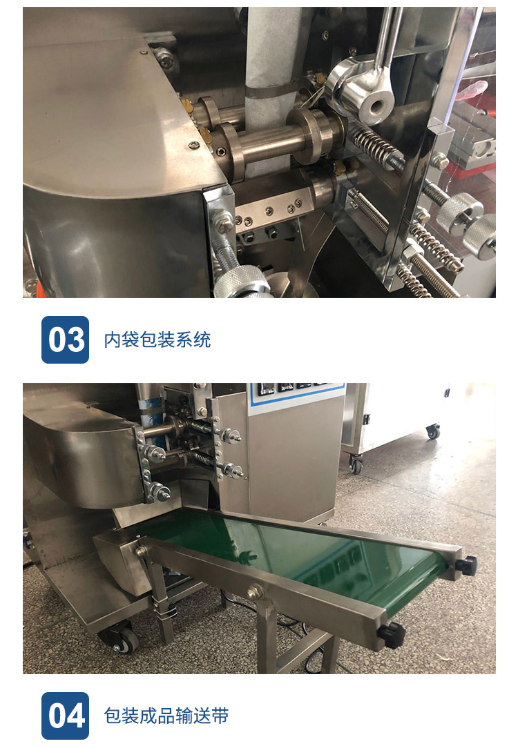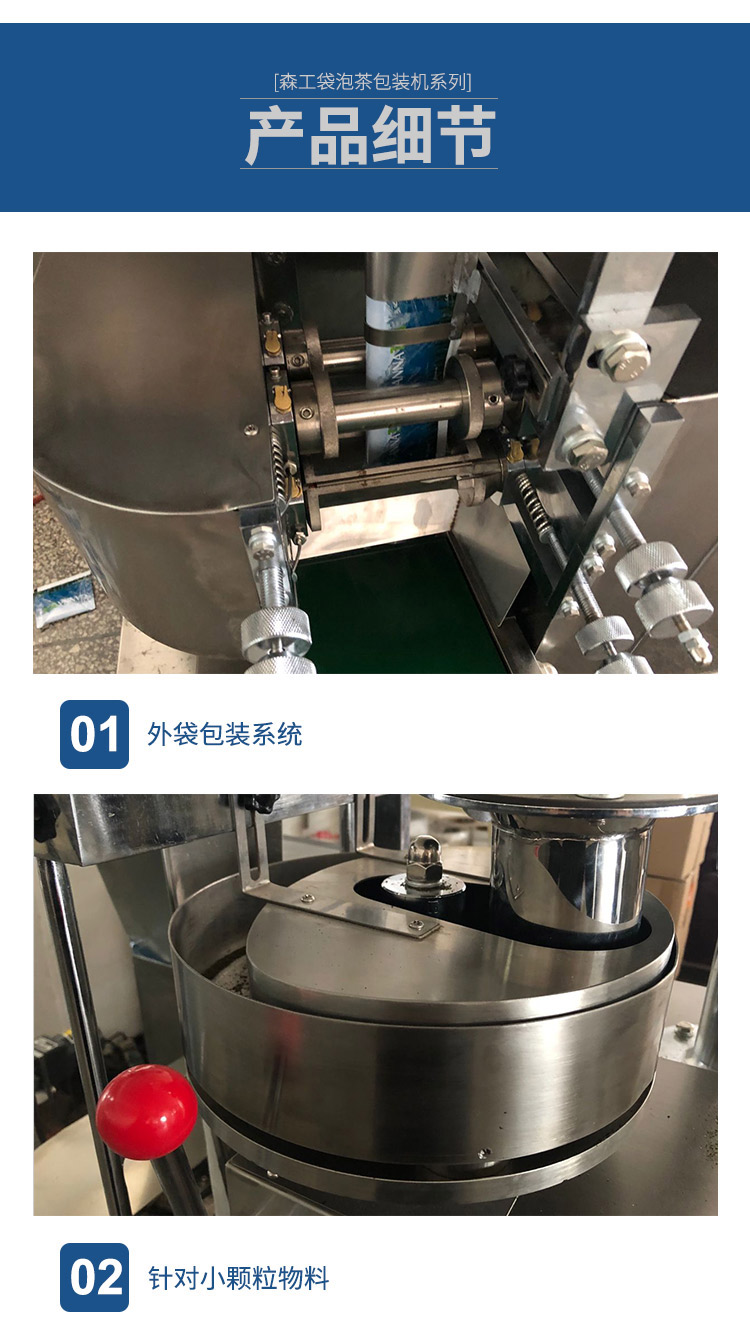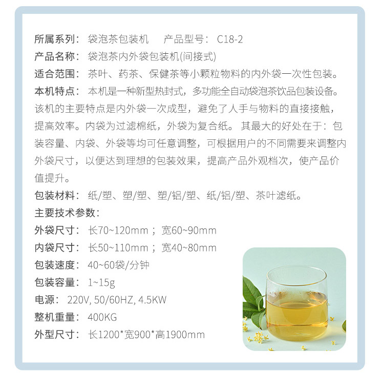 適合范圍: 本機(jī)適用于茶葉、藥茶、保健茶等小顆粒物的內(nèi)外袋一次性包裝。