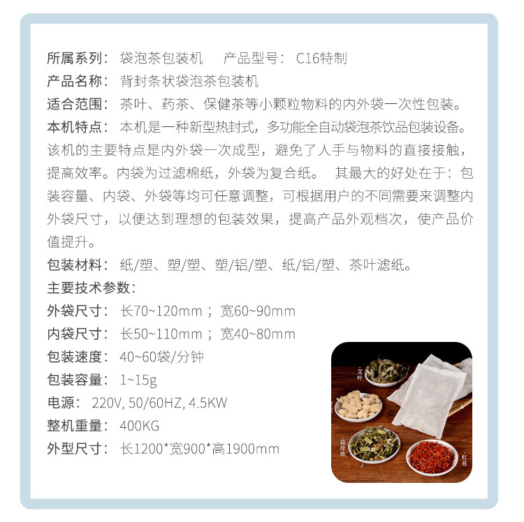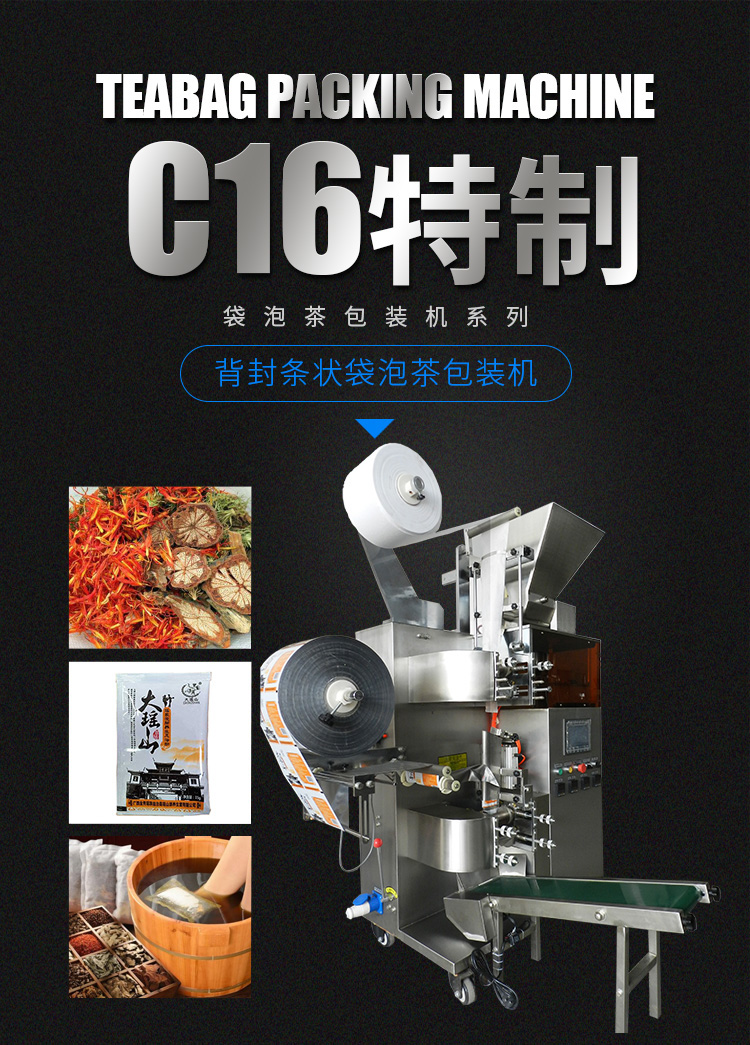 您的位置: 主頁 > 產(chǎn)品展示 > 袋泡茶包裝機(jī) > C16特制 全自動(dòng)螺桿料包內(nèi)外袋包裝機(jī)