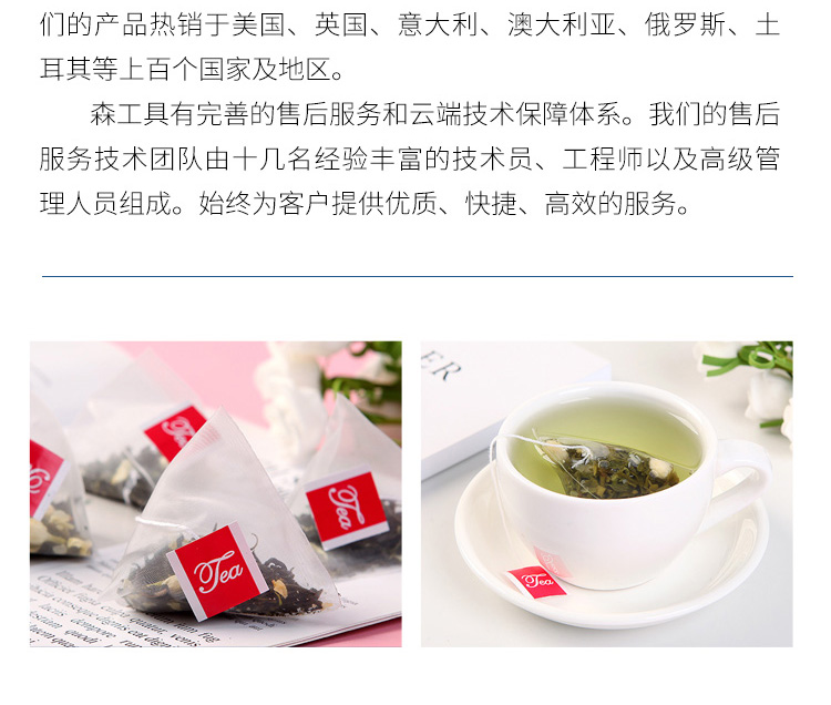 適合范圍: 茶葉、藥茶、保健茶等小顆粒物料的內(nèi)外袋一次性包裝。