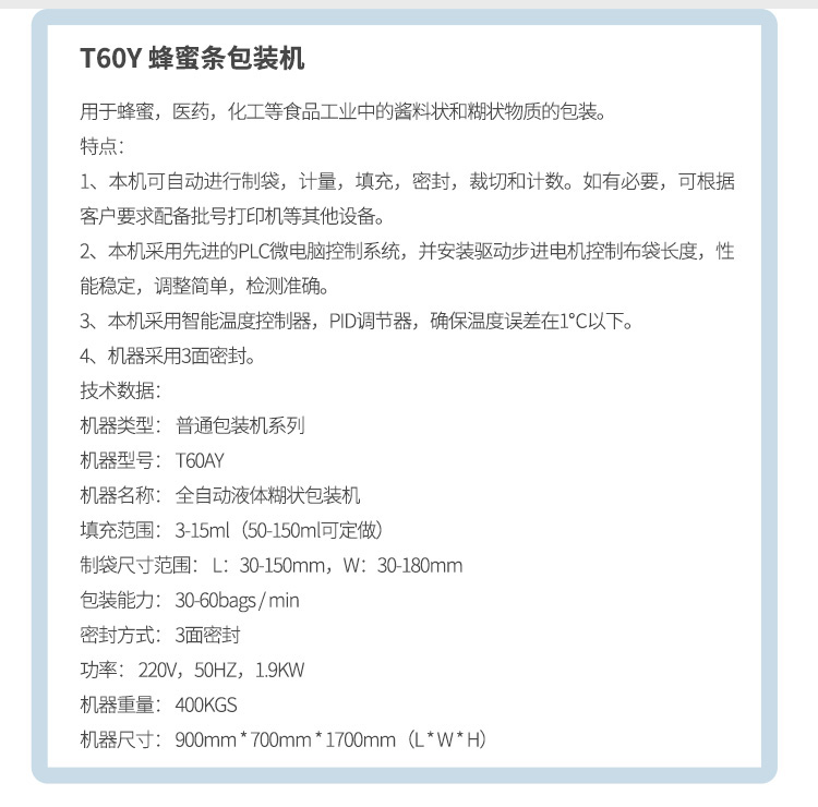 您的位置: 主頁 > 產(chǎn)品展示 > 粉末包裝機(jī) > T60Y蜂蜜條包裝機(jī)