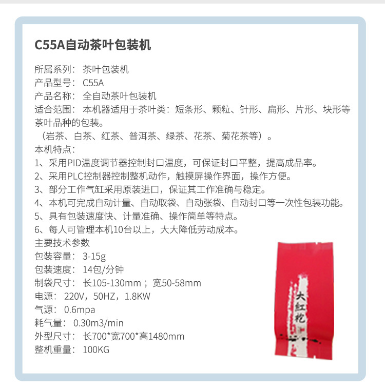 適合范圍: 本機器適用于茶葉類:短條形、顆粒、針形、扁形、片形、塊形等茶葉品種的包裝。
