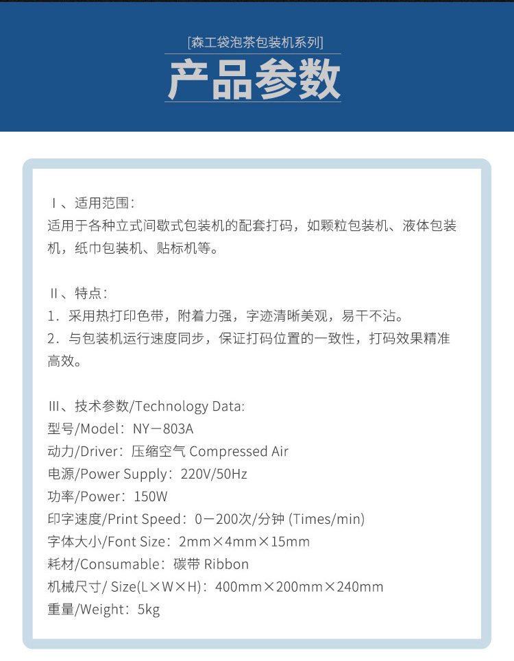 適用于各種立式間歇式包裝機的配套打碼,如顆粒包裝機、液體包裝機,紙巾包裝機、貼標機等。